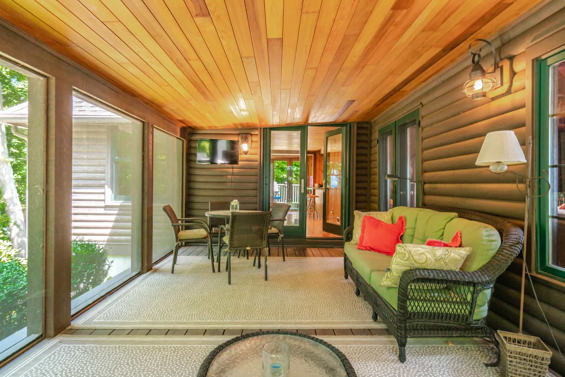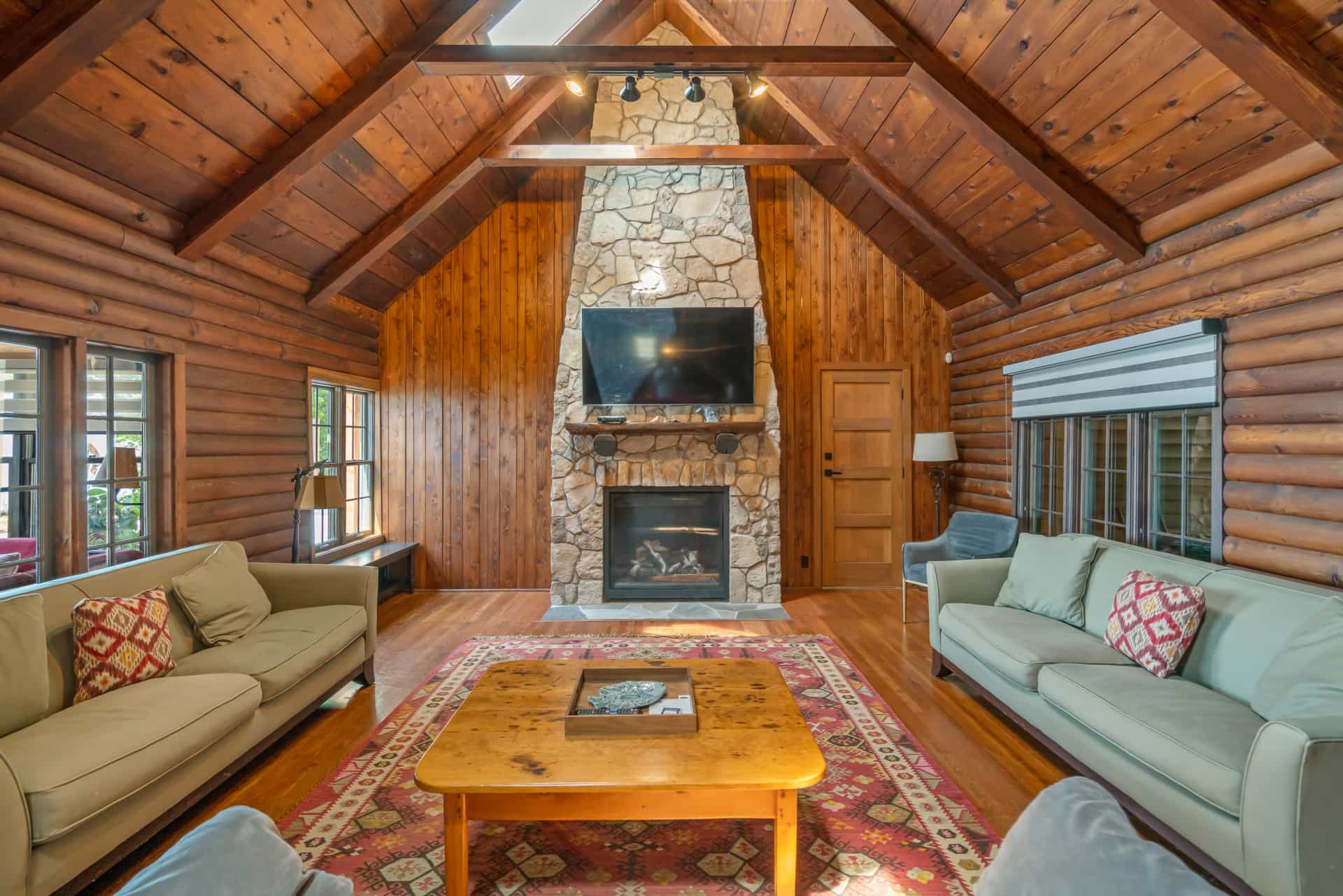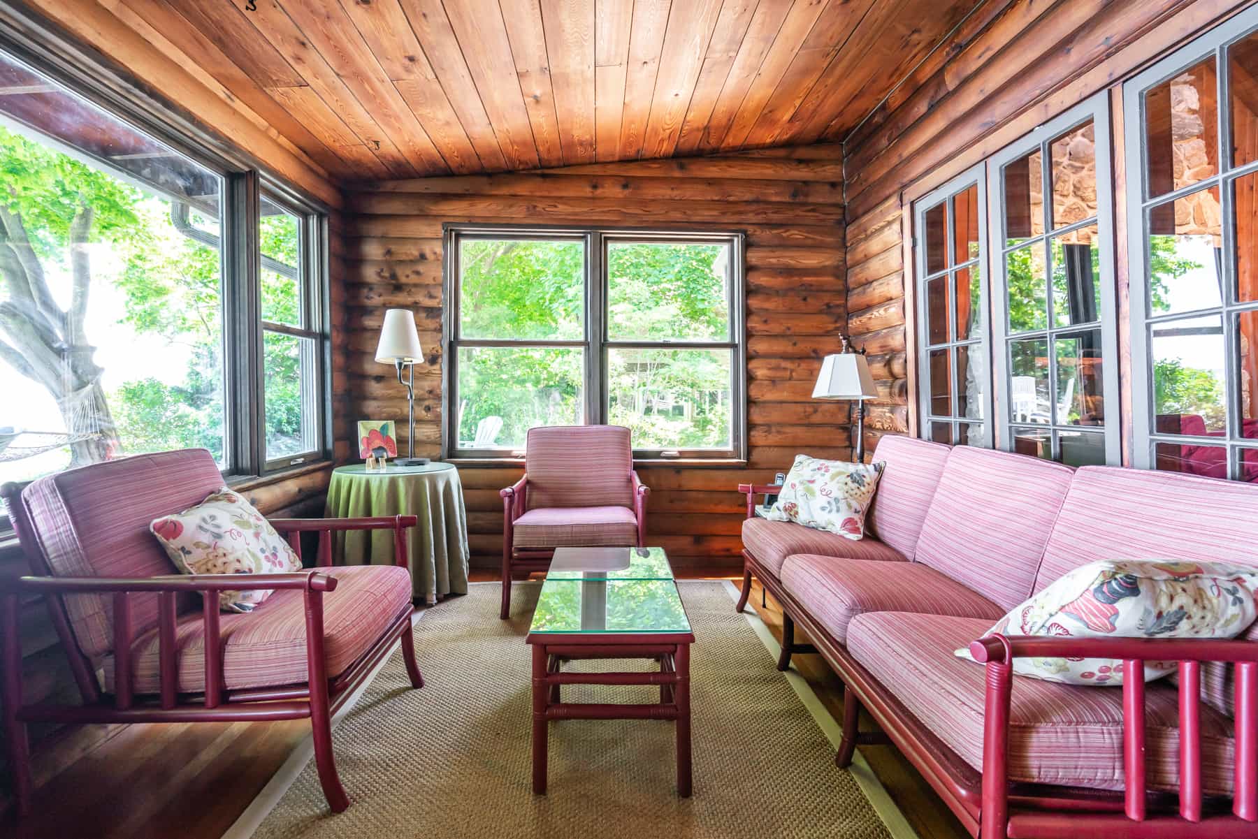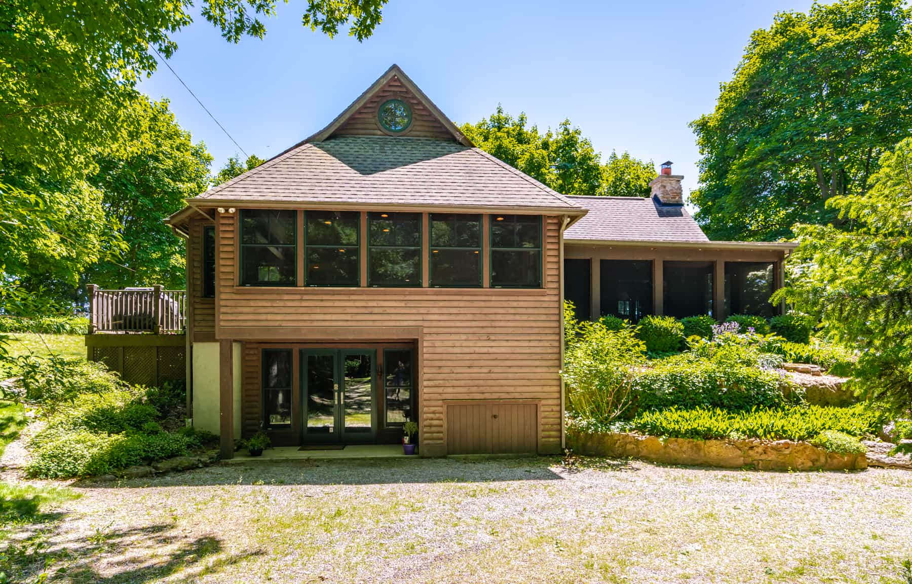 This spectacular cottage has striking views of the lake with many windows and an enormous screened in porch. A one of a kind cottage that offers the rustic feel of a cabin, but on a huge scale. Nestled on 2 acres the home is very private with a wooded back yard and an amazing beach. Cozy up by the gas fireplace (Fireplace not available between June 15 – August 31) on cool evenings and enjoy some family time. Note this home has and attached private separate unit that is rented long term to a guest that uses it occasionally and a second cottage behind that is a vacation rental and will share the beach.