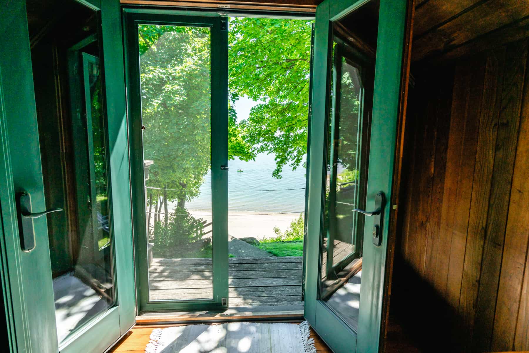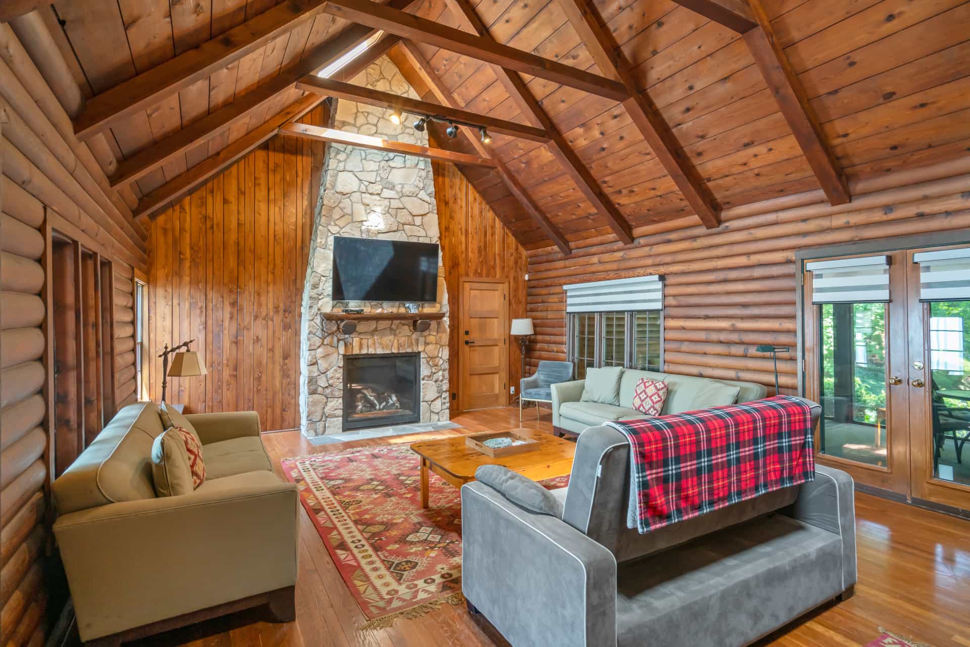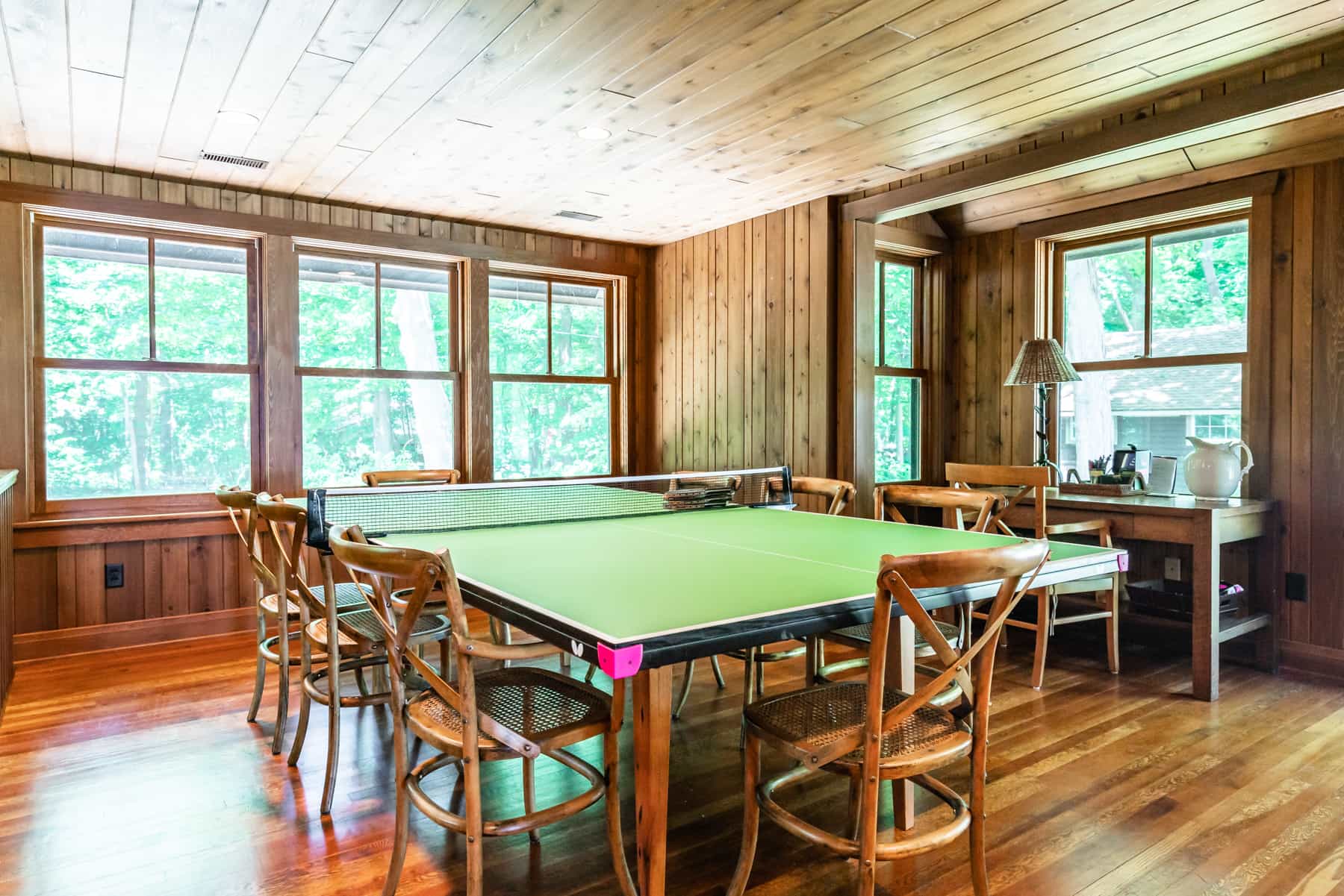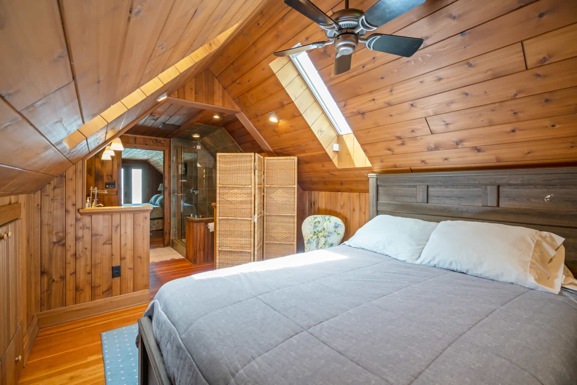 This spectacular cottage has striking views of the lake with many windows and an enormous screened in porch. A one of a kind cottage that offers the rustic feel of a cabin, but on a huge scale. Nestled on 2 acres the home is very private with a wooded back yard and an amazing beach. Cozy up by the gas fireplace (Fireplace not available between June 15 – August 31) on cool evenings and enjoy some family time. Note this home has and attached private separate unit that is rented long term to a guest that uses it occasionally and a second cottage behind that is a vacation rental and will share the beach.