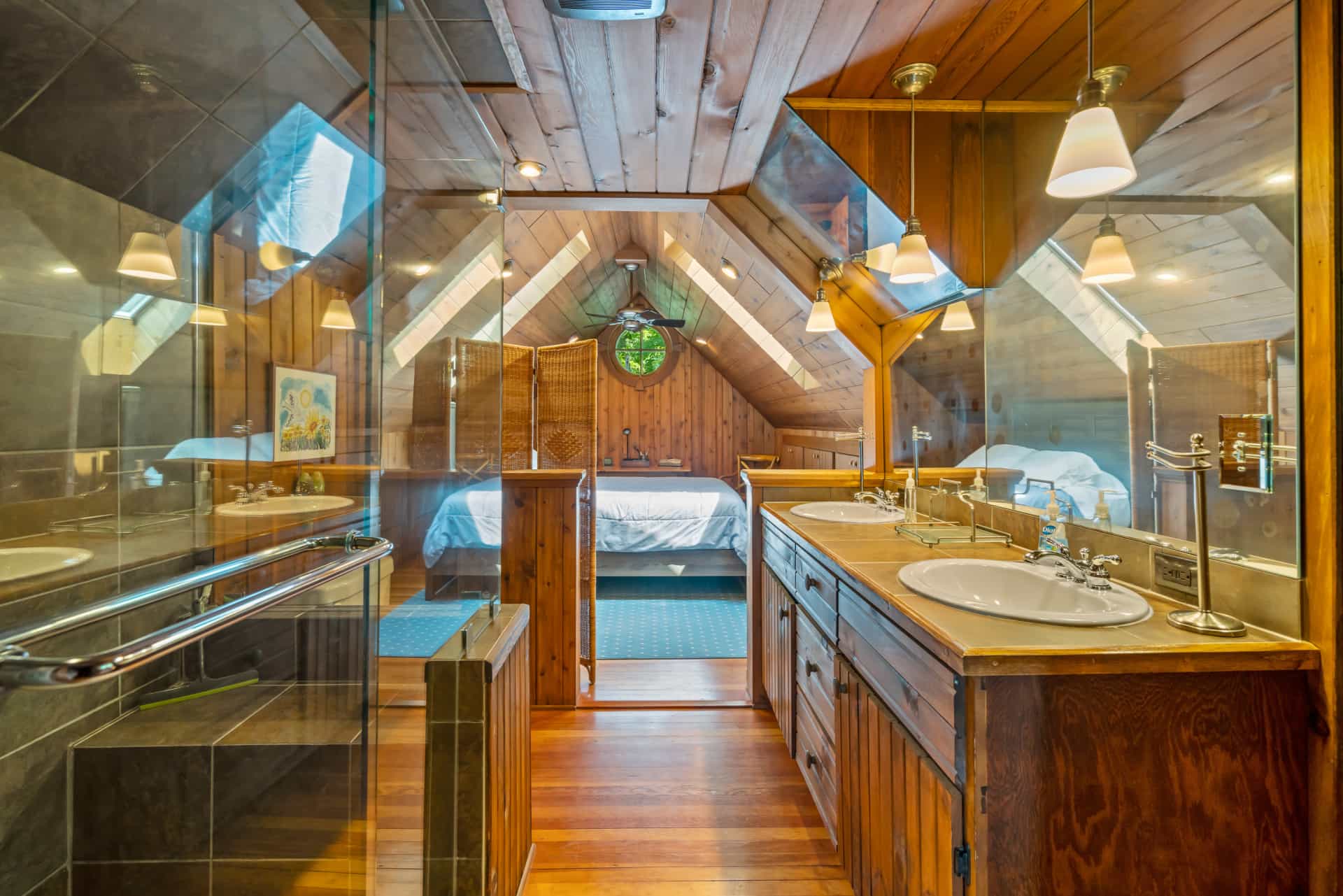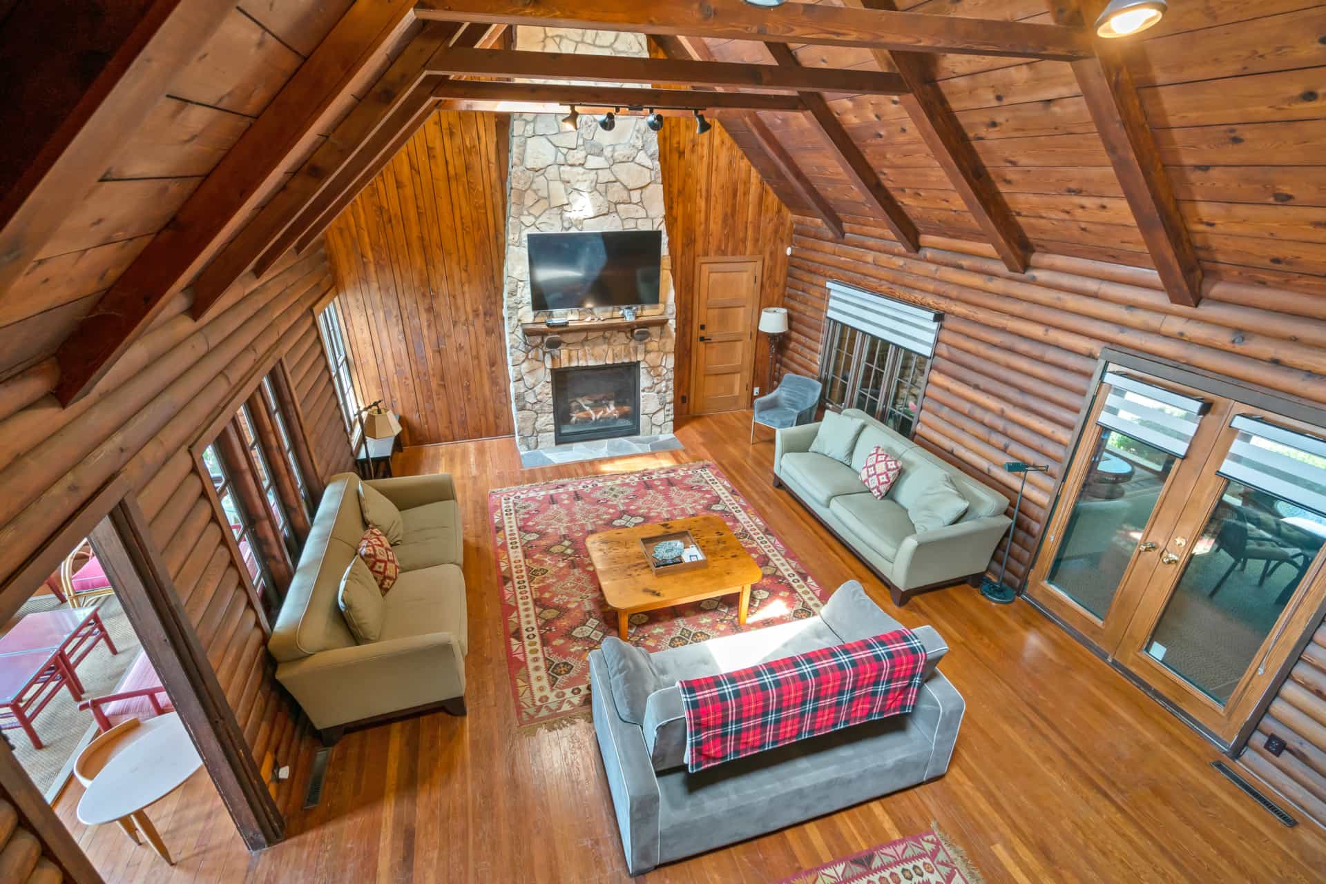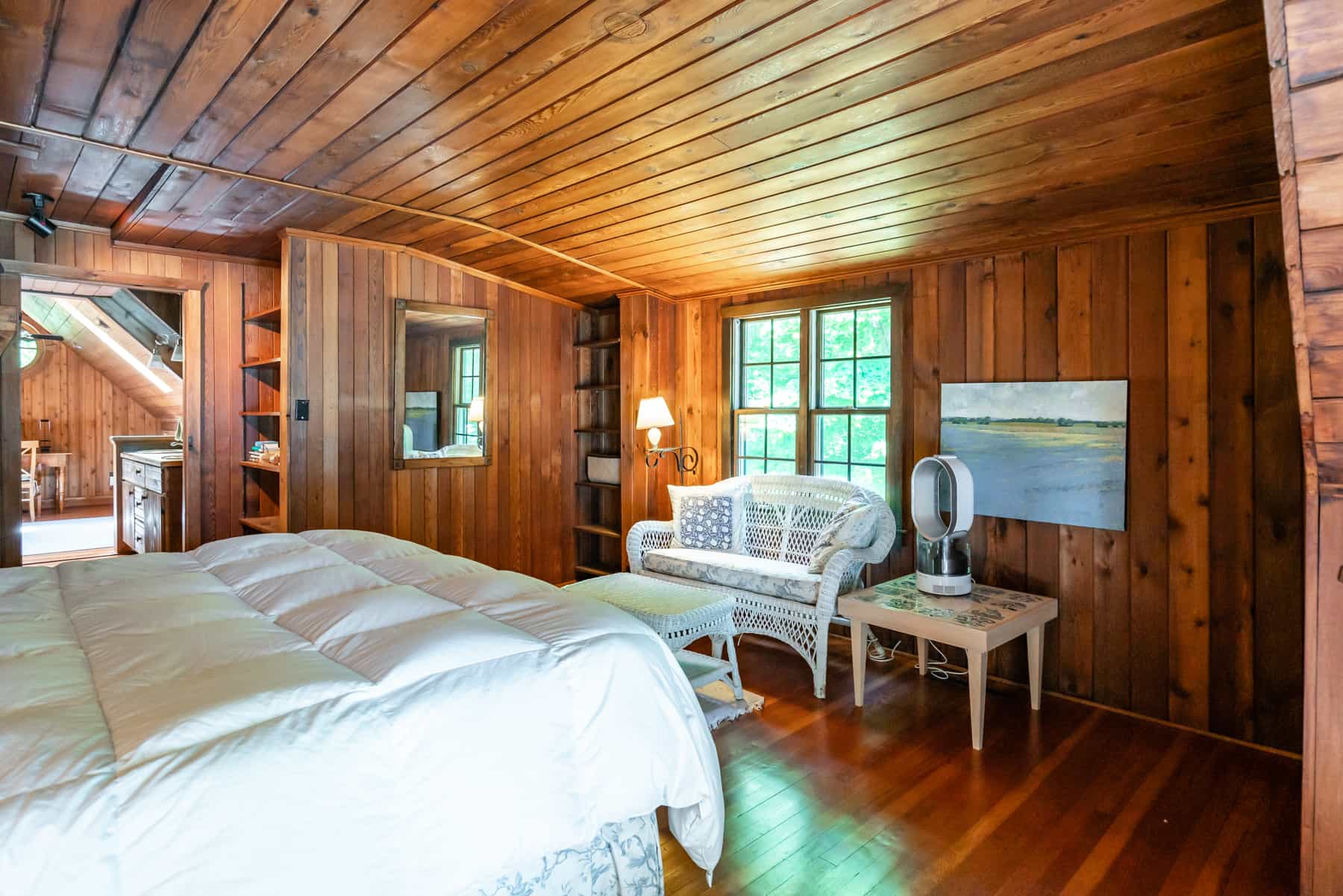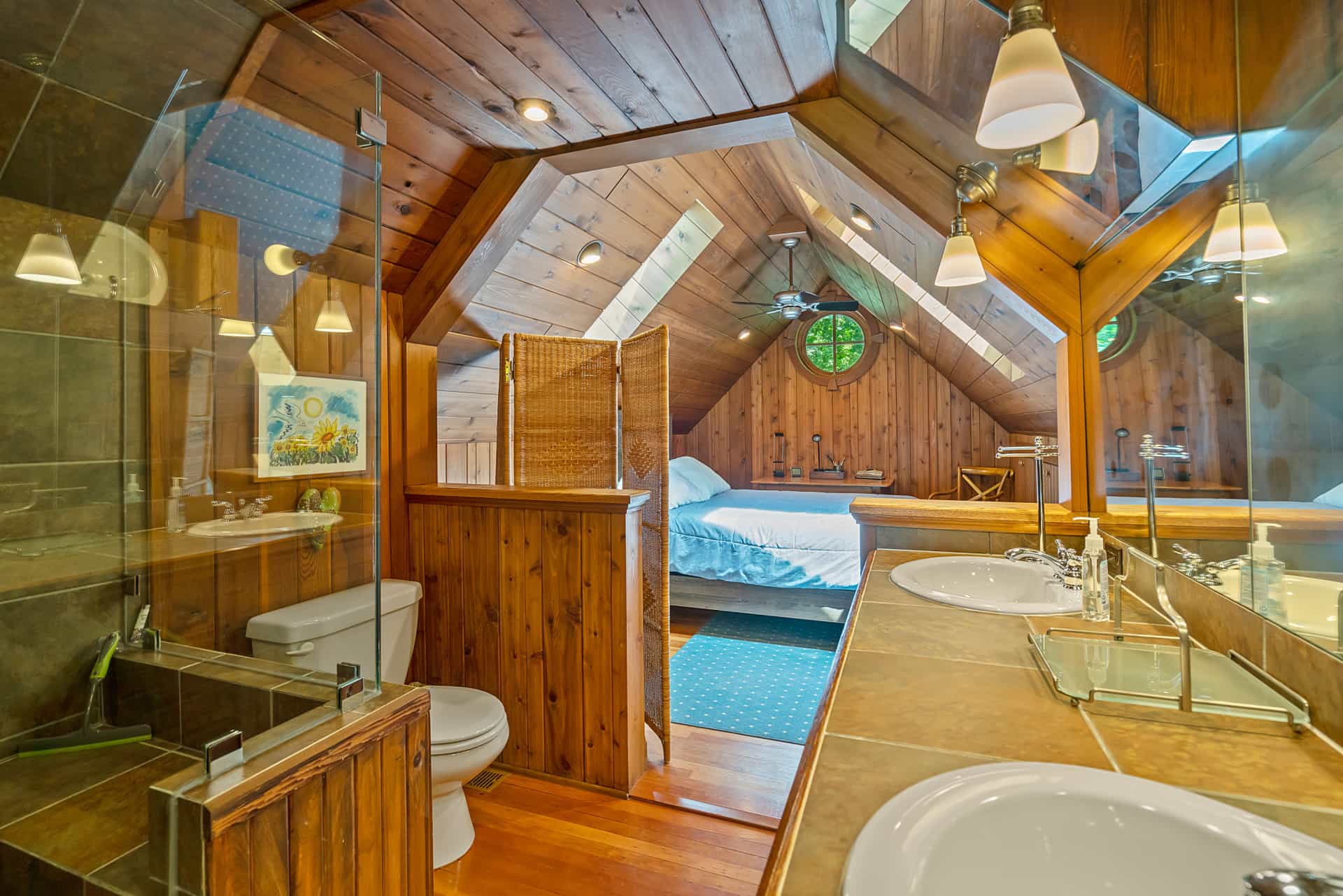 This spectacular cottage has striking views of the lake with many windows and an enormous screened in porch. A one of a kind cottage that offers the rustic feel of a cabin, but on a huge scale. Nestled on 2 acres the home is very private with a wooded back yard and an amazing beach. Cozy up by the gas fireplace (Fireplace not available between June 15 – August 31) on cool evenings and enjoy some family time. Note this home has and attached private separate unit that is rented long term to a guest that uses it occasionally and a second cottage behind that is a vacation rental and will share the beach.