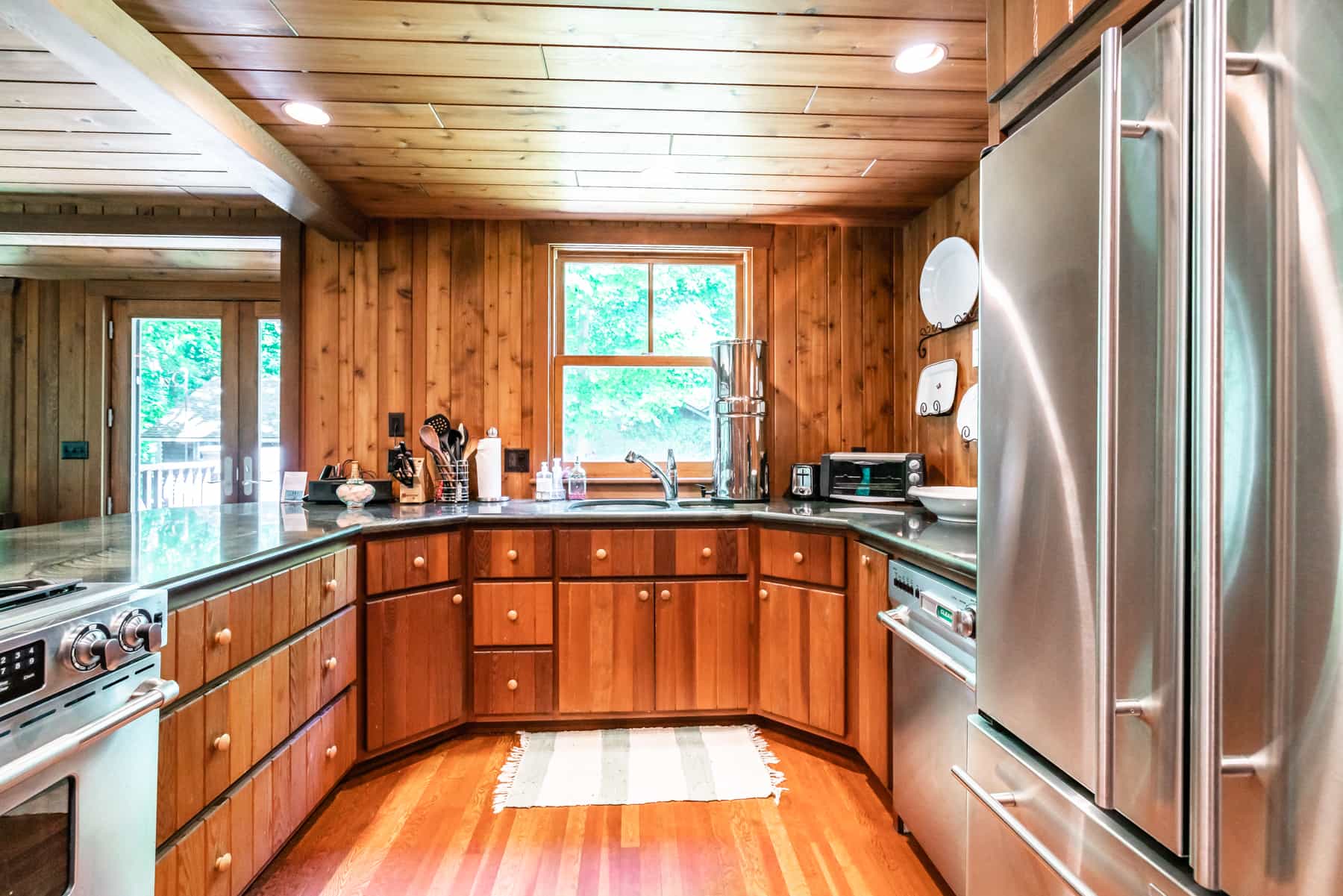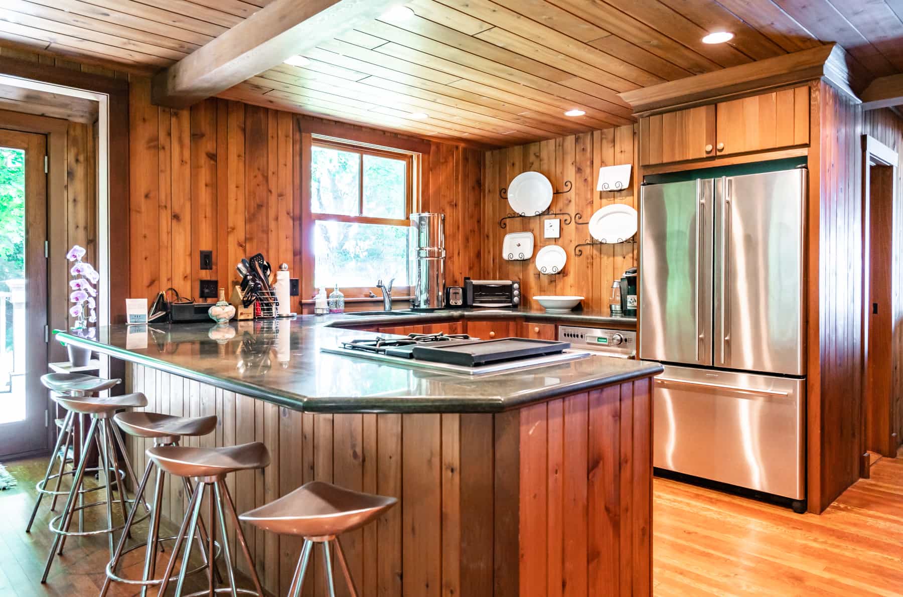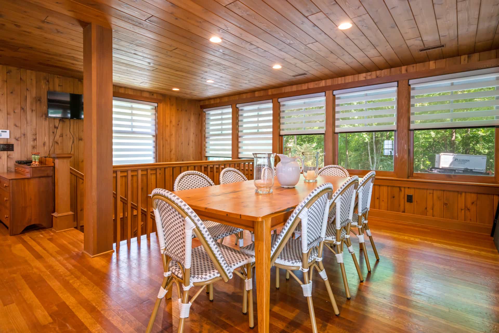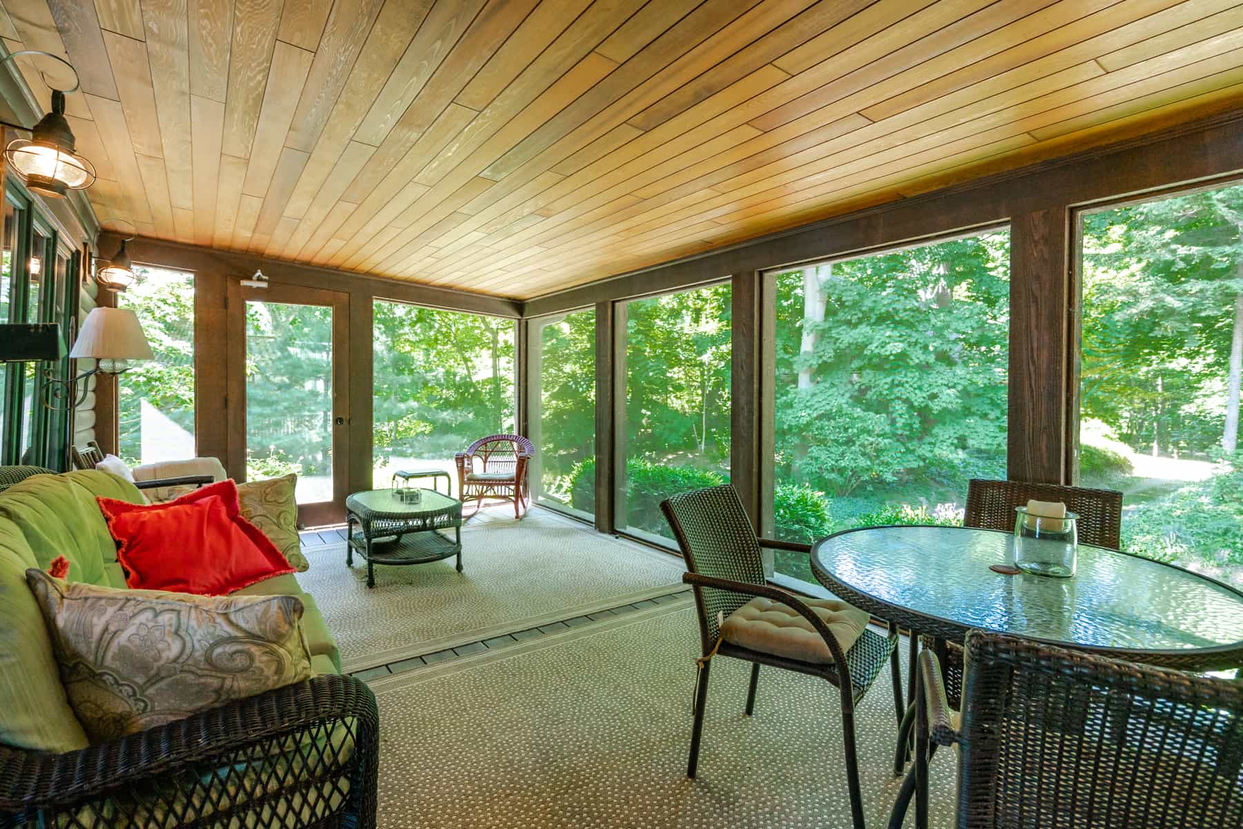 This spectacular cottage has striking views of the lake with many windows and an enormous screened in porch. A one of a kind cottage that offers the rustic feel of a cabin, but on a huge scale. Nestled on 2 acres the home is very private with a wooded back yard and an amazing beach. Cozy up by the gas fireplace (Fireplace not available between June 15 – August 31) on cool evenings and enjoy some family time. Note this home has and attached private separate unit that is rented long term to a guest that uses it occasionally and a second cottage behind that is a vacation rental and will share the beach.