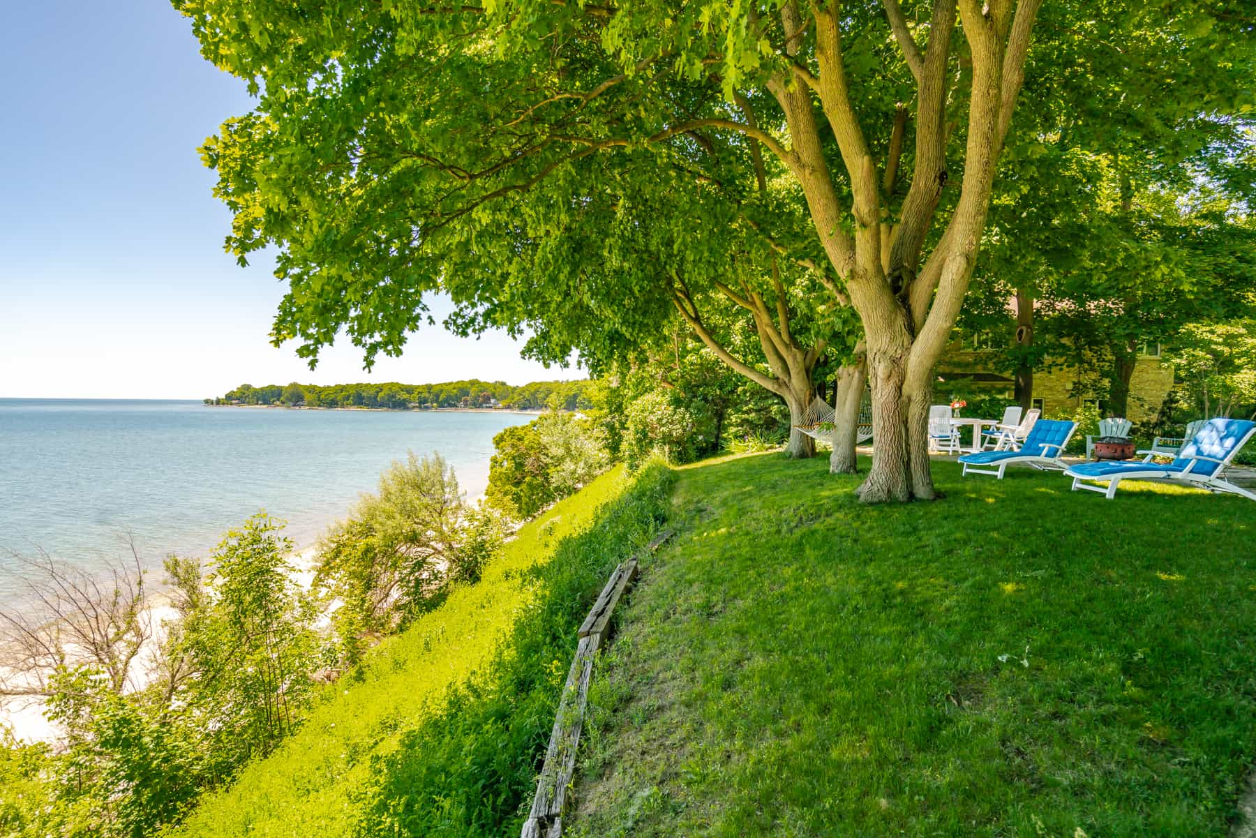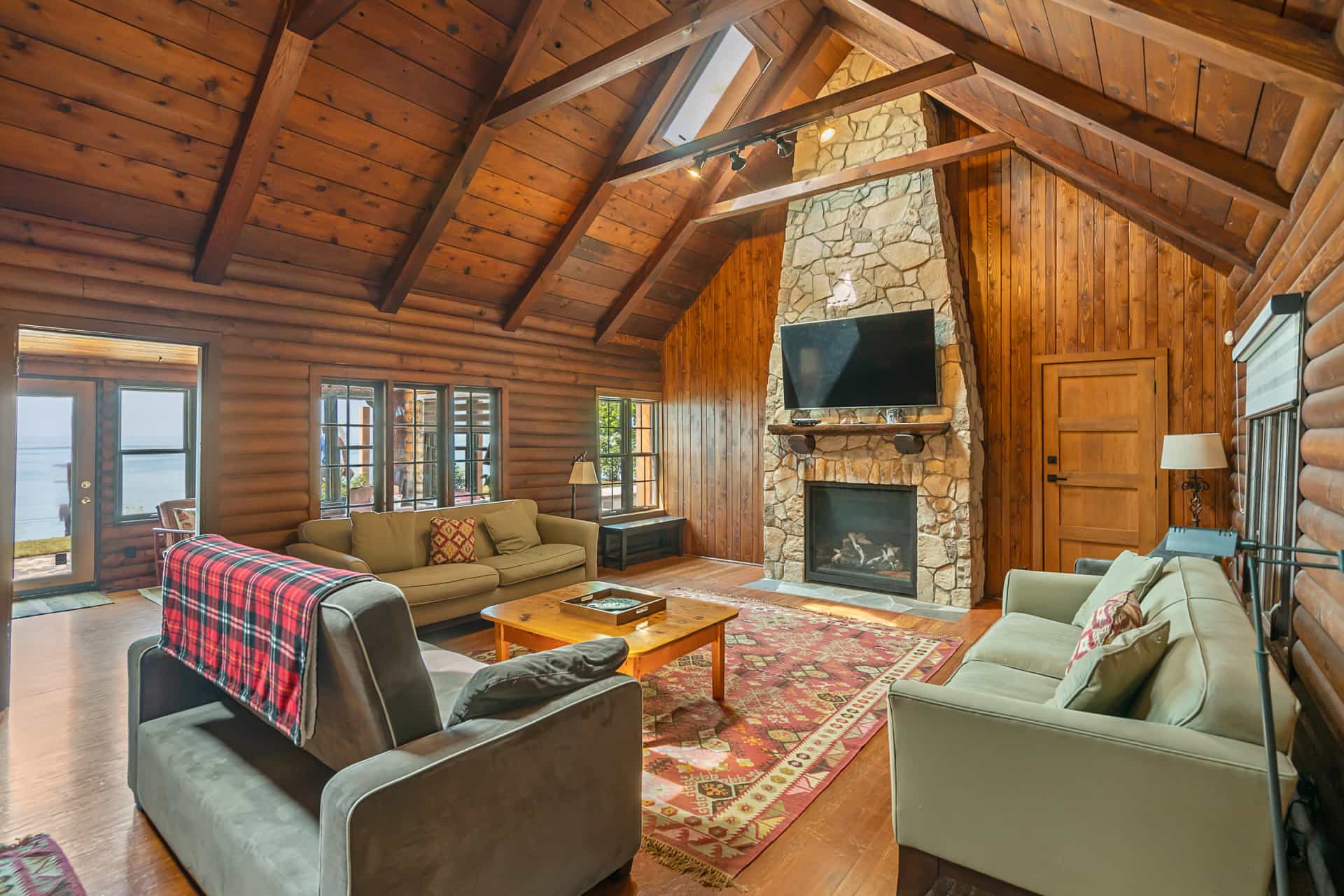 ituated on 2 acres this stunning beachfront cottage has striking views of Cedar Bay. With 3 Bedrooms boasting Lake Views and 3 Baths it comfortably sleeps 9 guests. A very spacious home a large living room and two enormous screened in porches provide plenty of room. A one of a kind secluded cottage that offers the rustic feel of a cabin, but on a huge scale.