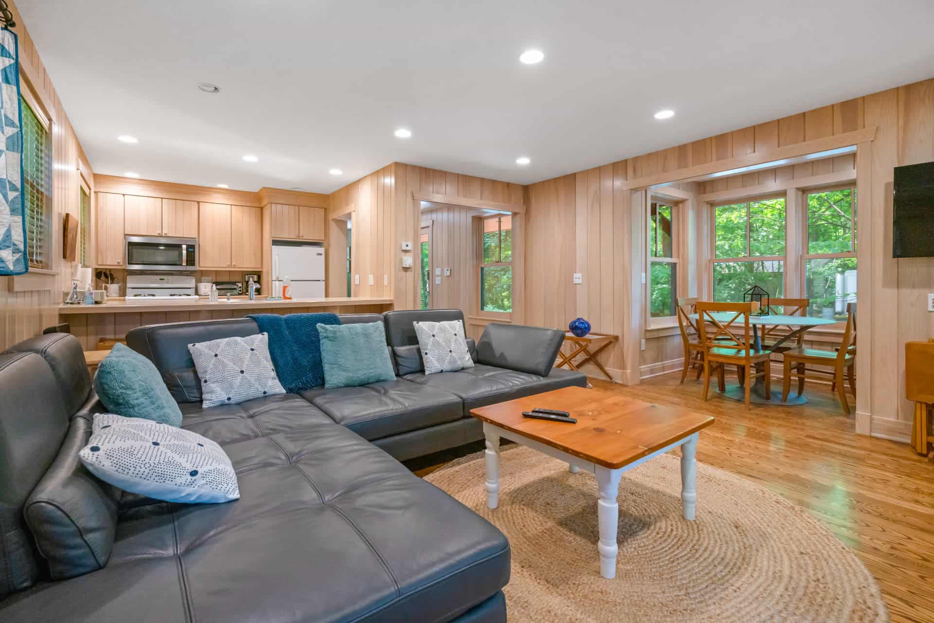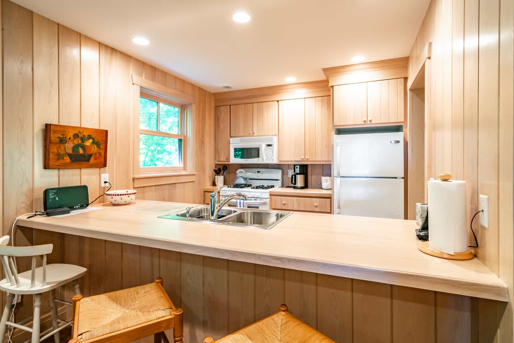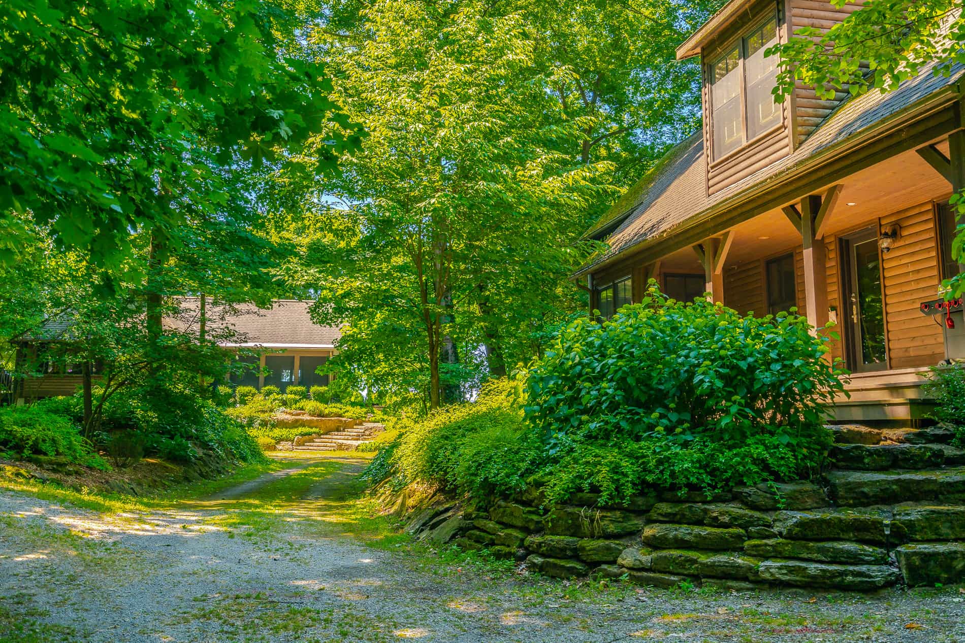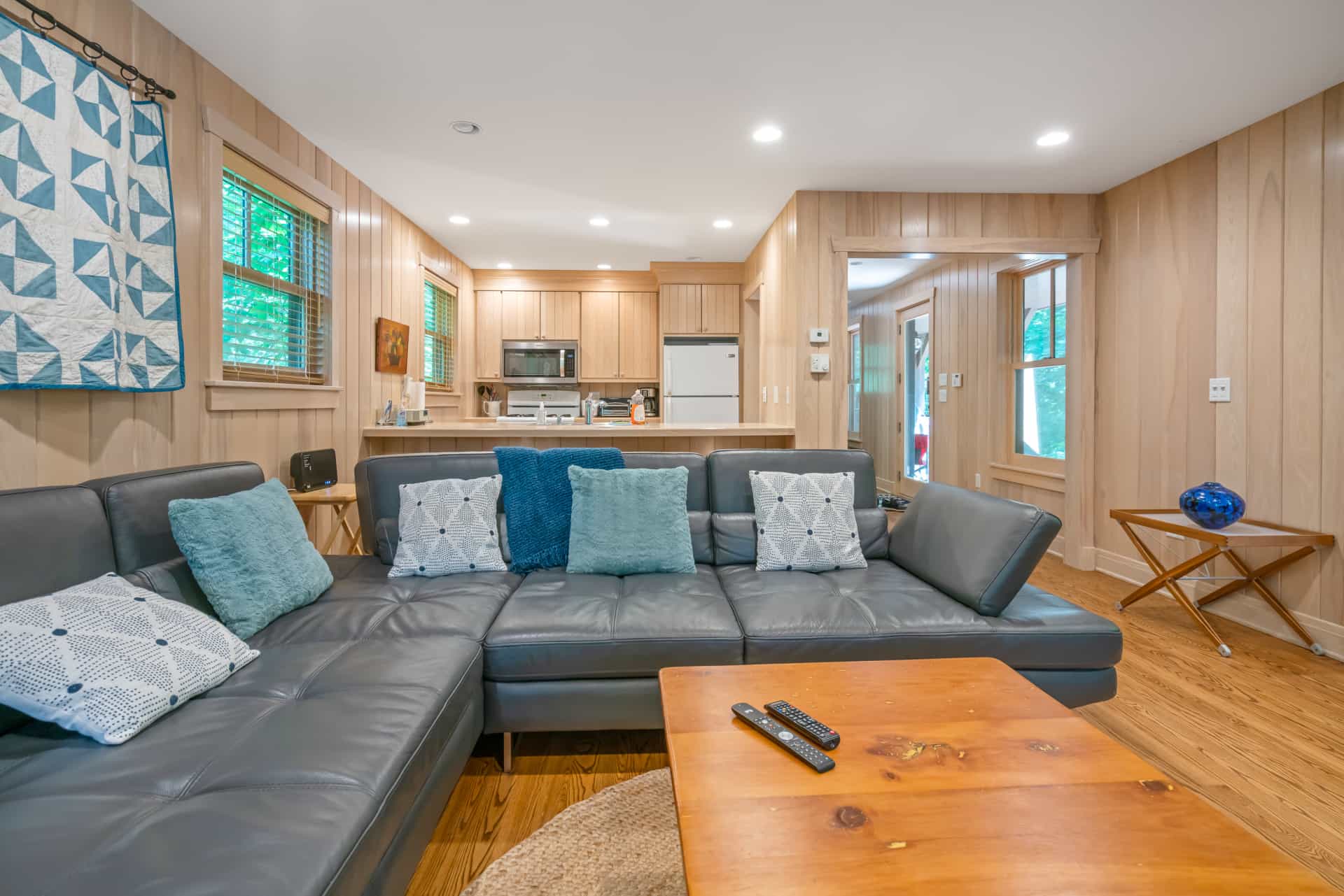 The 2 acre lot has a front house and a back house with plenty of room for all and ample parking. This is the back house and it must be noted that guests may be in the front house at the same time. The private beach is shared with the front cottage guests but it is a large beach with plenty of room. With stairs down the the private beach this is a perfect vacation spot if you are looking to get away from it all.