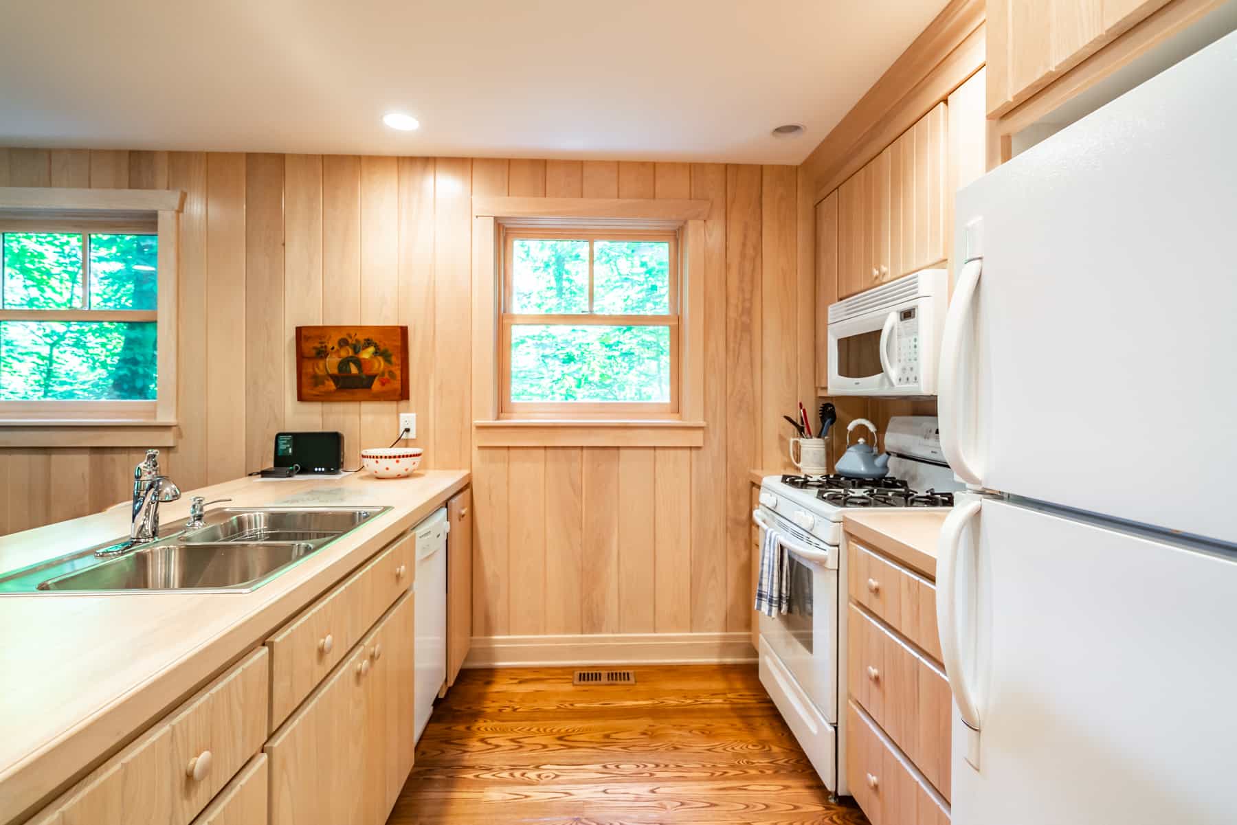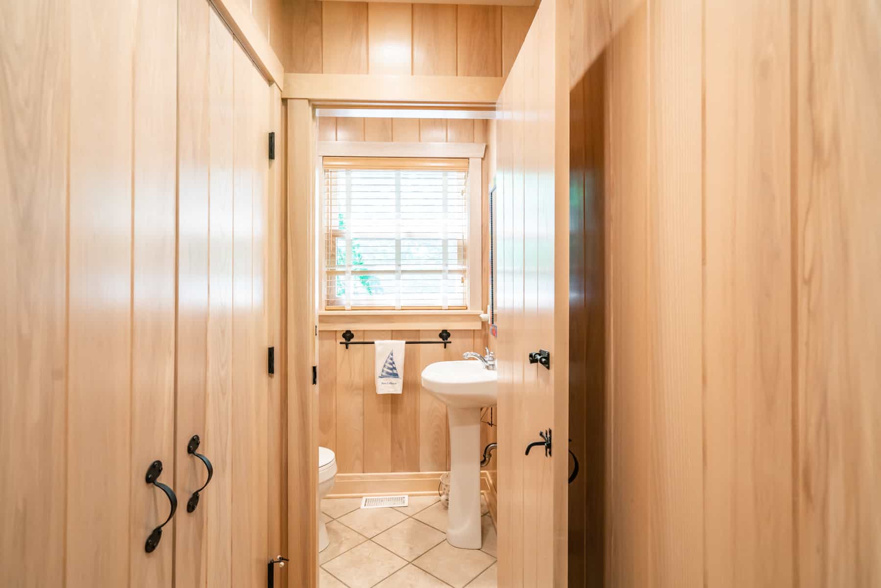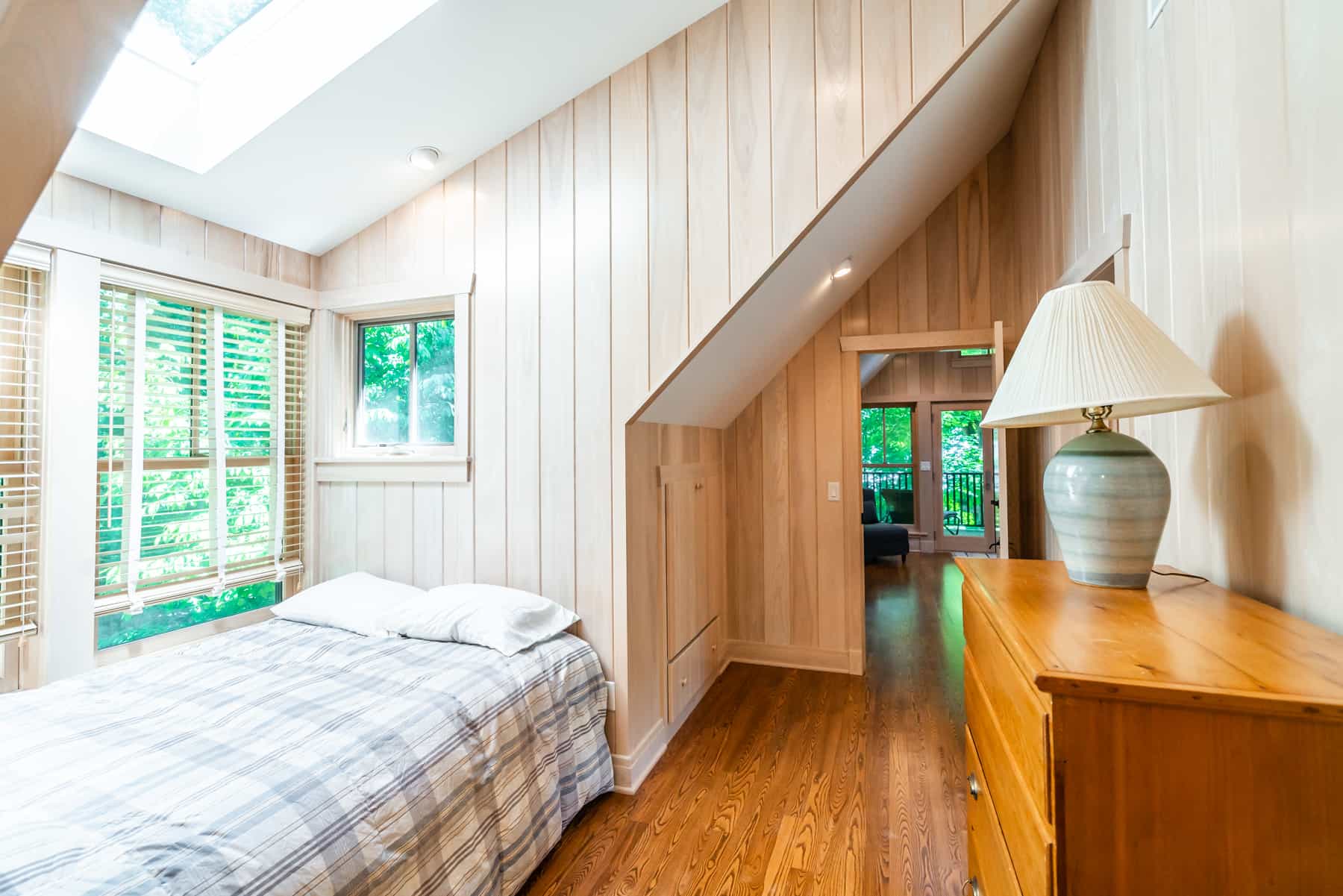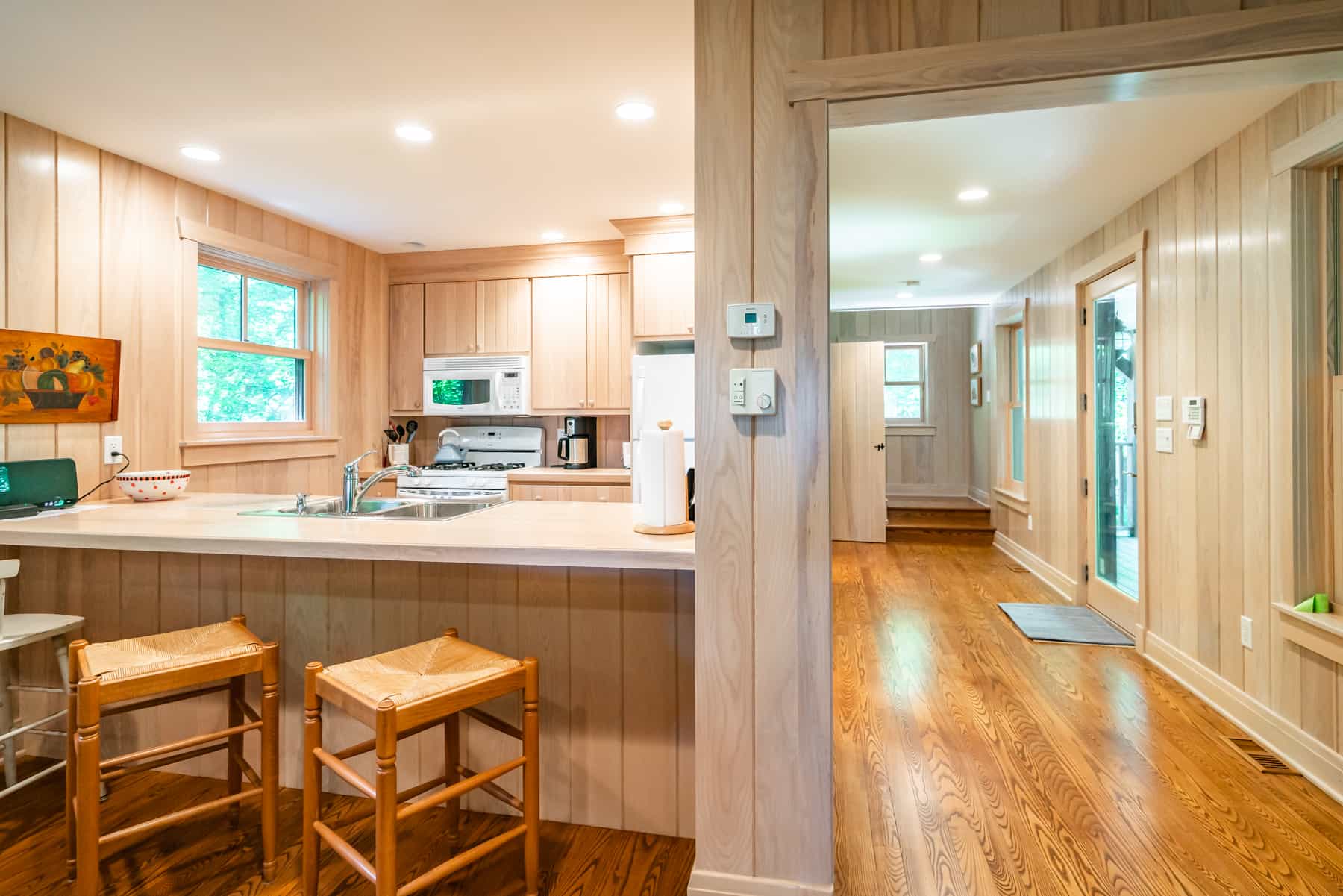 The 2 acre lot has a front house and a back house with plenty of room for all and ample parking. This is the back house and it must be noted that guests may be in the front house at the same time. The private beach is shared with the front cottage guests but it is a large beach with plenty of room. With stairs down the the private beach this is a perfect vacation spot if you are looking to get away from it all.