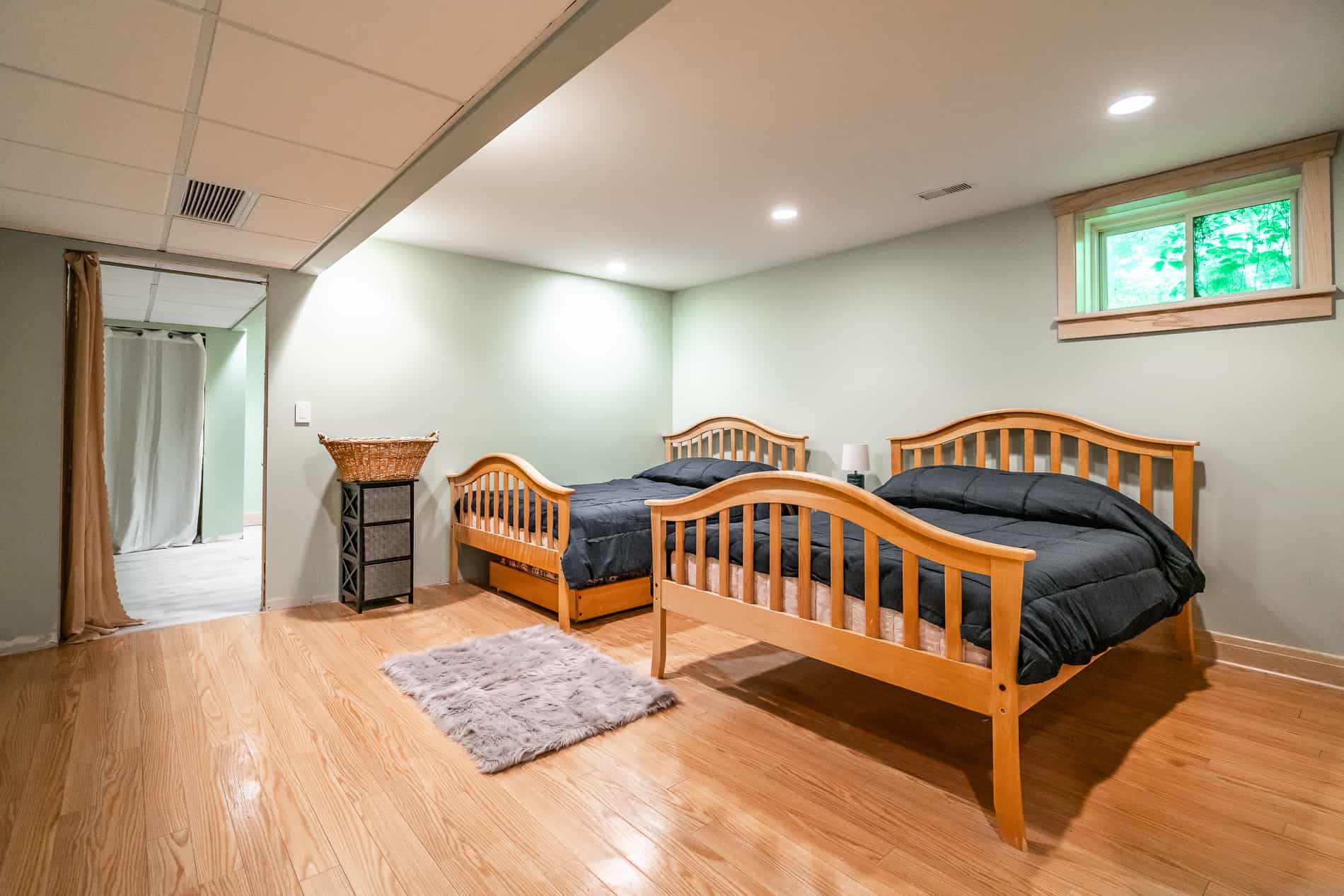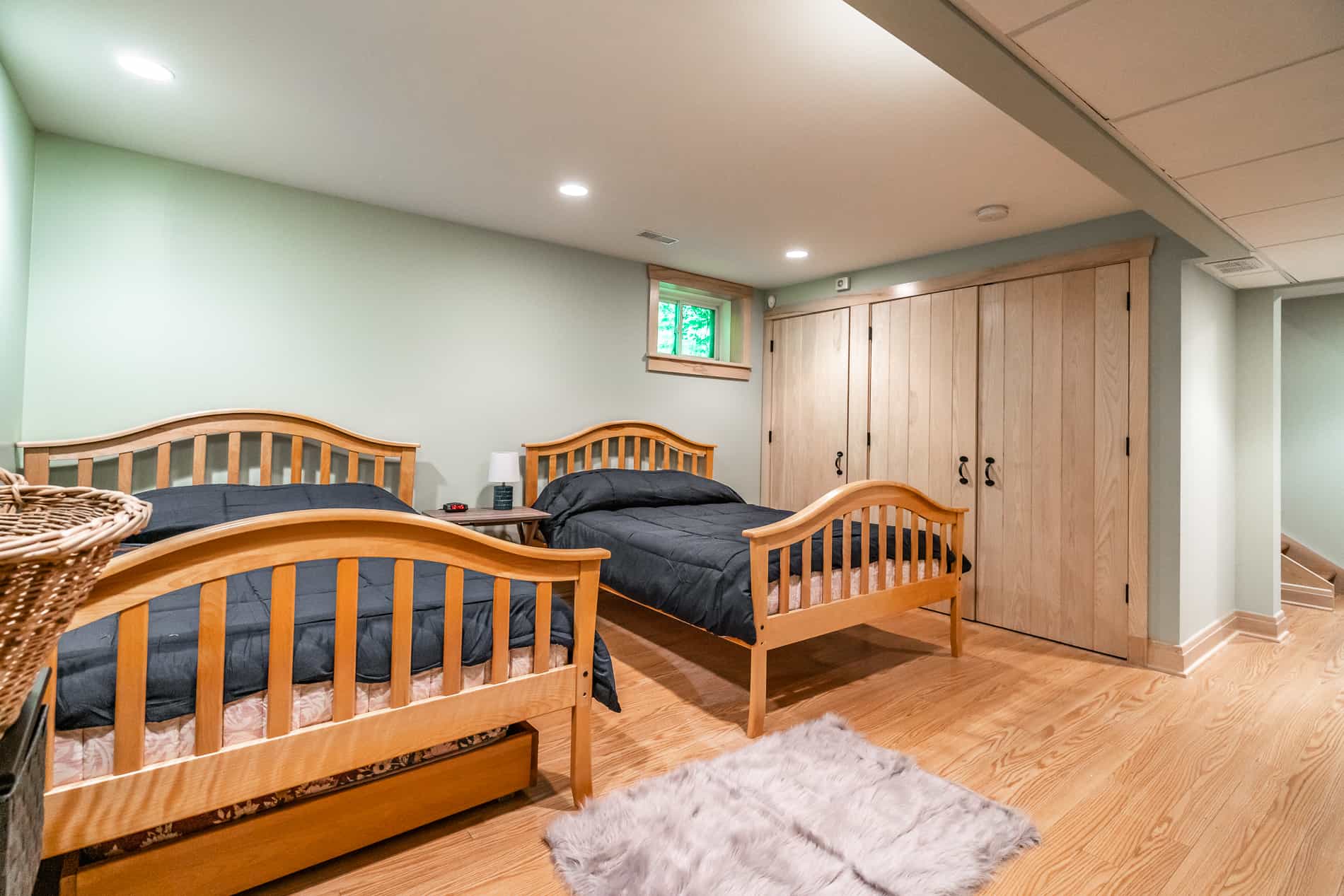 Bedroom 3 – two double beds with single trundle on lowest level (sleeps 5). This room is open to the staircase to the lower level.