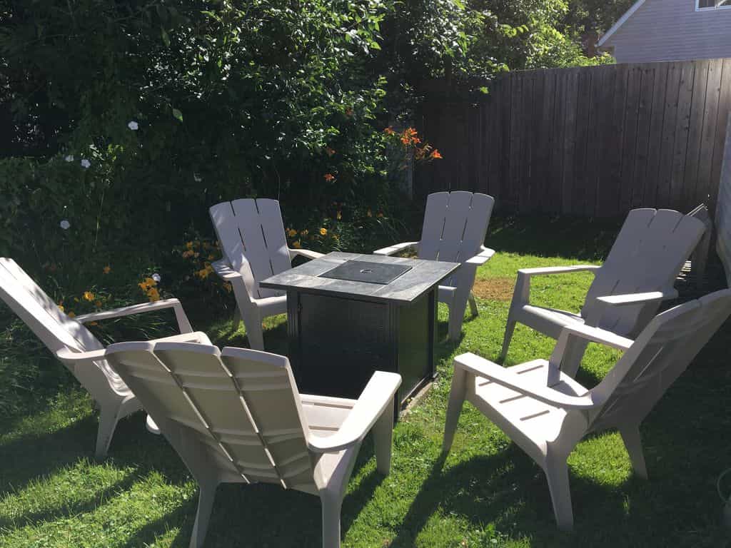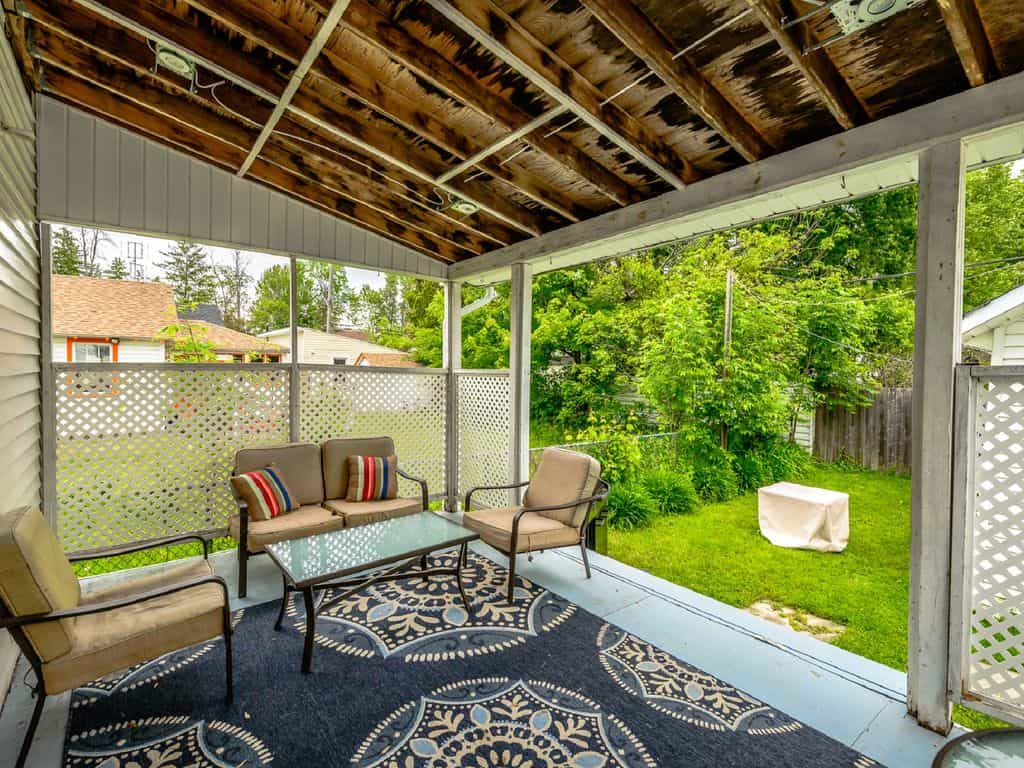 Outside, we have a covered deck with outdoor seating, our propane BBQ (seasonally May through October) and a small fire pit for evening marshmallows and hotdogs.